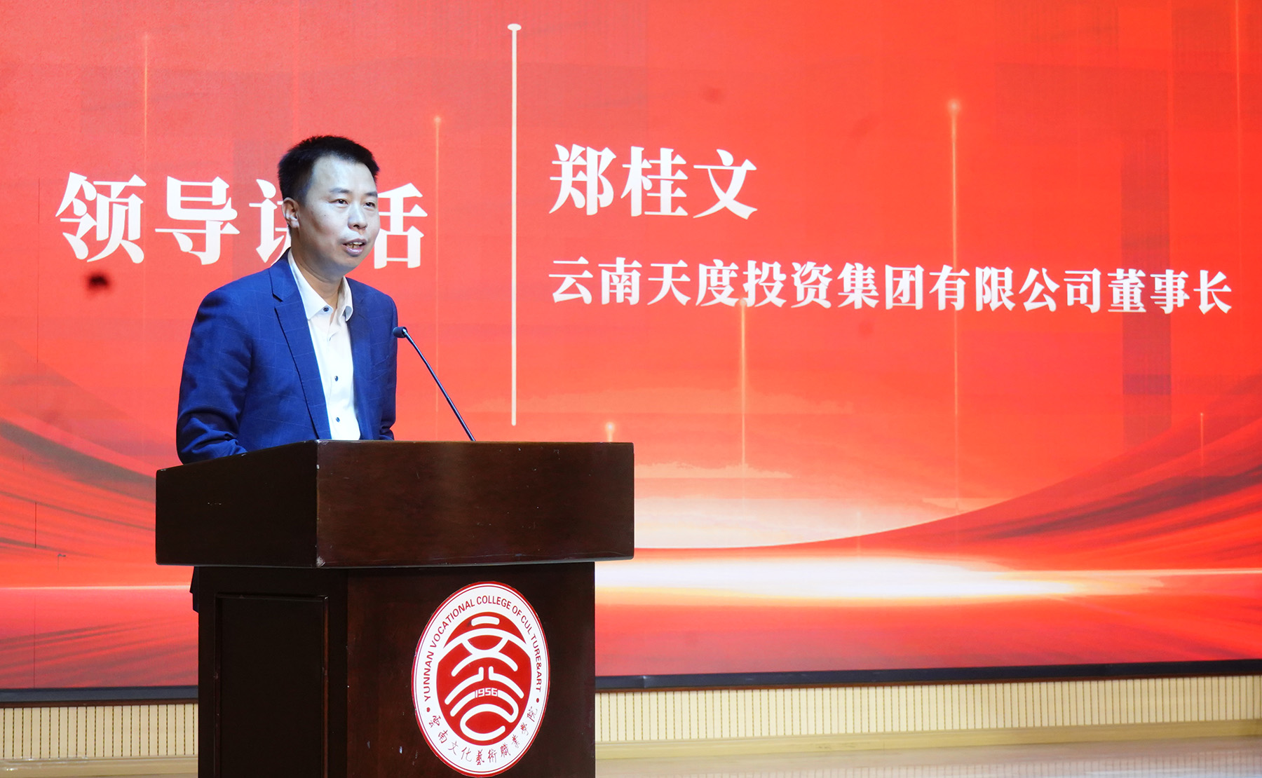 鄭桂文董事長(zhǎng)在致辭中表示,此次合作是校企雙方貫徹落實(shí)國(guó)家職業(yè)教育改革政策、深化產(chǎn)教融合的重要舉措,也是天度集團(tuán)踐行“以產(chǎn)業(yè)反哺教育、以教育賦能未來(lái)”使命的重要一步。天度集團(tuán)將發(fā)揮其作為區(qū)域數(shù)字經(jīng)濟(jì)龍頭企業(yè)所擁有大數(shù)據(jù)研究院、博士后科研工作站等技術(shù)資源優(yōu)勢(shì),以及深耕數(shù)字經(jīng)濟(jì)20年的產(chǎn)業(yè)優(yōu)勢(shì),與學(xué)校共同聚焦融媒體技術(shù)與運(yùn)營(yíng)、人工智能技術(shù)應(yīng)用、軟件技術(shù)、信息安全應(yīng)用技術(shù)等相關(guān)專(zhuān)業(yè),通過(guò)“共建共管”模式深化產(chǎn)教融合,圍繞數(shù)字經(jīng)濟(jì)、文旅融合等重點(diǎn)產(chǎn)業(yè)發(fā)展需求,共同建設(shè)校內(nèi)外實(shí)訓(xùn)基地,克隆企業(yè)真實(shí)研發(fā)環(huán)境,構(gòu)建專(zhuān)業(yè)集群交叉矩陣,共同制定專(zhuān)業(yè)發(fā)展規(guī)劃,定期評(píng)估產(chǎn)業(yè)趨勢(shì),動(dòng)態(tài)優(yōu)化課程體系,保持教學(xué)內(nèi)容與產(chǎn)業(yè)發(fā)展同步,實(shí)現(xiàn)“產(chǎn)業(yè)需求進(jìn)大綱、技術(shù)標(biāo)準(zhǔn)進(jìn)課堂、真實(shí)項(xiàng)目進(jìn)實(shí)訓(xùn)”,合力打造精準(zhǔn)適配市場(chǎng)需求的特色專(zhuān)業(yè)集群,培養(yǎng)數(shù)字經(jīng)濟(jì)領(lǐng)域高素質(zhì)技術(shù)技能型人才,賦能區(qū)域數(shù)字經(jīng)濟(jì)、文旅融合等重點(diǎn)產(chǎn)業(yè)發(fā)展。鄭董事長(zhǎng)還強(qiáng)調(diào)指出,希望通過(guò)此次合作,雙方將進(jìn)一步推動(dòng)成立產(chǎn)業(yè)學(xué)院并使其成為云南文化藝術(shù)產(chǎn)業(yè)數(shù)字化的“創(chuàng)新引擎”,讓每一位學(xué)子在這里找到“用技術(shù)守護(hù)文化、用創(chuàng)意點(diǎn)亮人生”的舞臺(tái)!共同書(shū)寫(xiě)產(chǎn)教融合的新篇章,為云南乃至全國(guó)的數(shù)字經(jīng)濟(jì)及文旅融合產(chǎn)業(yè)注入新的活力與動(dòng)能!